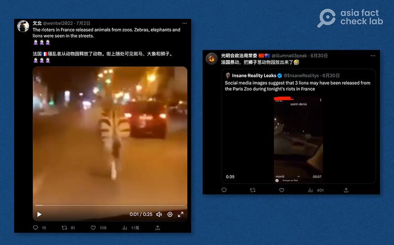 亚洲事实查核实验室以“法国暴动”“动物园”等关键字在推特以及脸书上搜寻,发现数个帐号转贴相关内容并附上不同影片。其中流传最广的是斑马与狮子“逃出动物园”的片段。