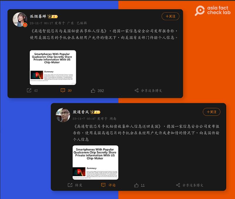 但亚洲事实查核实验室发现这种说法是错的。这份报告的原文是说高通芯片可以将诠释资料(有关个人通讯的资讯)送回公司,而不是美国政府。一位专家告诉AFCL,无论是从技术或法律层面,都没有证据证明美国当局会自动存取发送到美国伺服器的资料。