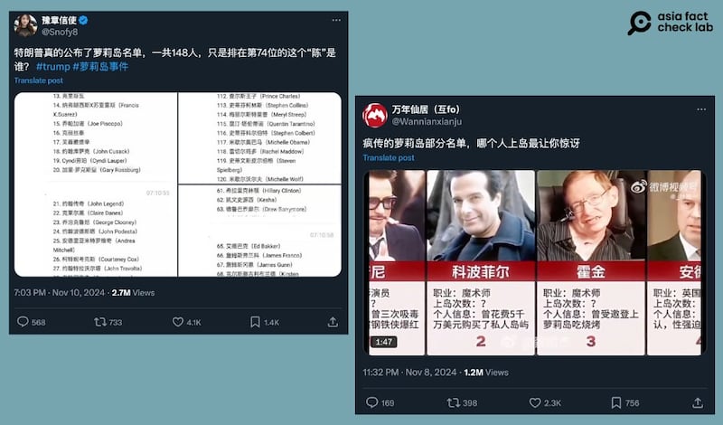 近期多个X账号转发三张"爱泼斯坦岛"(中文原名小圣詹姆斯岛,又称恋童癖岛、萝莉岛)的宾客名单,称特朗普实现选前承诺,揭露共148人在内的名单。其中" 豫章信使"及" 万年仙居"转发该消息至今,已累积将近四百万的阅读量。台媒《新头壳》也发表相关 新闻,直接引用"豫章信使"的帖文。