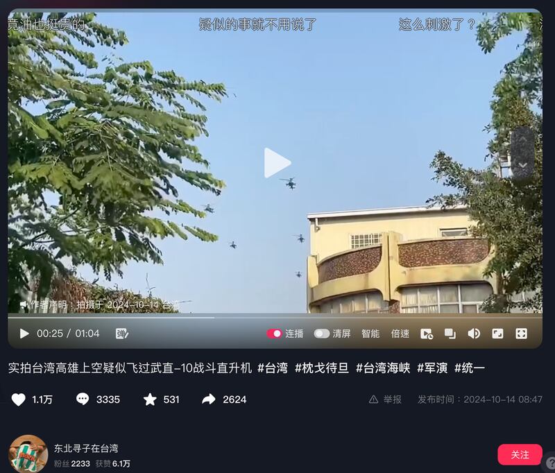 解放军10月14日围台军演引发广泛关注,抖音上流传的视频消息称解放军的“武直-10”(WZ-10)直升机在军演期间飞越台湾高雄上空。亚洲事实查核实验室访问军事专家,比对影片中的战机,发现其应为AH-64阿帕契以及UH-60M黑鹰直升机而并非解放军的“武直-10”。台湾陆军航空特战指挥部也回应称,影片中的AH-64E、UH-60M直升机是台湾执行例行训练的机队,且该影片与解放军的这次军演无关。