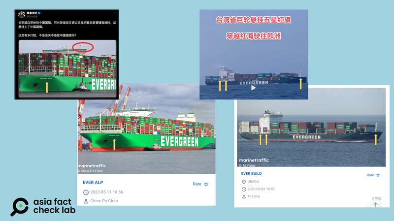 亚洲事实查核实验室(Asia Fact Check Lab,下简称AFCL)以船身喷漆字样以及船只外观,并用以图反搜辅助,辨识出网传的两艘船只分别为长荣旗下的“EVER ALP”以及“EVER BUILD”。