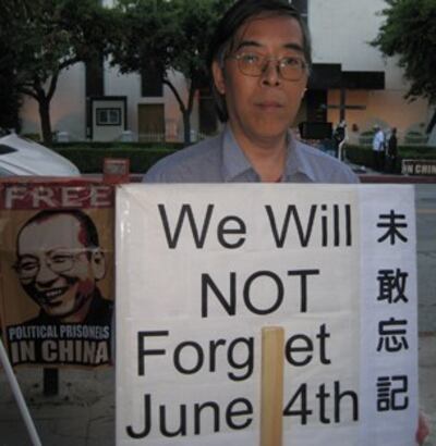 洛杉矶香港论坛主席关树越表示:"我们每年都会来到这里,向共产党说'我们没有忘记!",希望他们尽快政治改革,尊重十三亿人民的尊严,给中国人基本人权。今年是1989年天安门事件发生之后,首次没有司徒华的六四纪念日,华叔是我们永远尊重的人,每次想起他,心里都比较激动…老人家从六十岁开始支持中国民运,到了晚年,当局不准他再踏上中国内地的土地,我们对此感到很悲哀,但是,也会继续争取平反六四。"