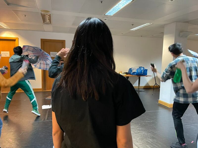 而在受访前,团队正在为话剧其中一幕彩排,重现香港中文大学抗争一幕,并加入更多舞蹈、形体动作及夸张的表演元素。