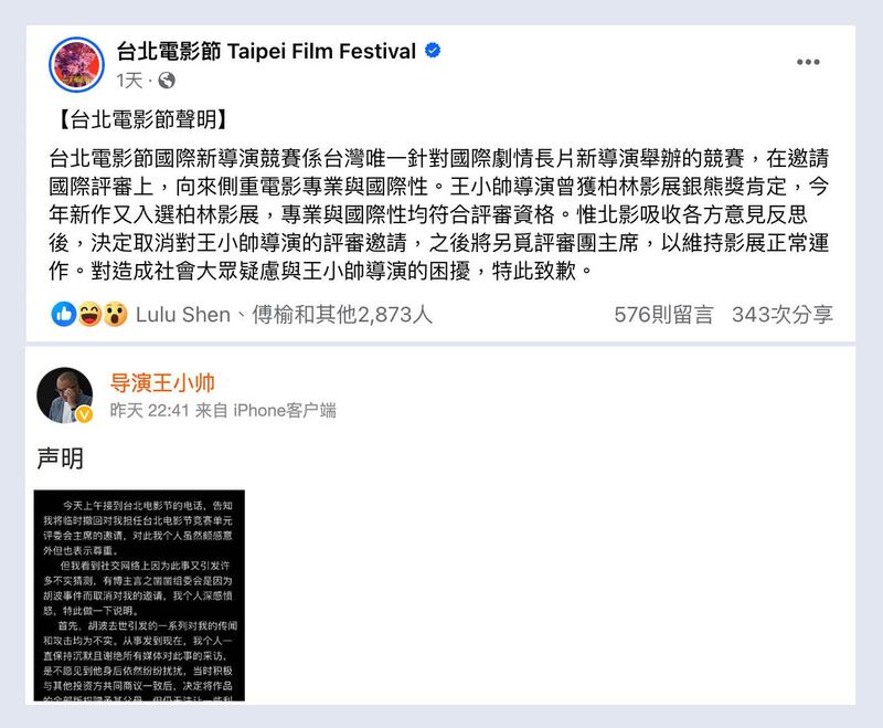 台北电影节6月9日在官网发声明说,在邀请国际评审的问题上侧重电影专业与国际性,王小帅导演曾获柏林影展银熊奖肯定,今年的新作又入选柏林影展,他的专业与国际性均符合评审资格。惟北影吸收各方意见反思后,决定取消对王小帅导演的评审邀请,对造成社会大众疑虑与王小帅导演的困扰致歉。