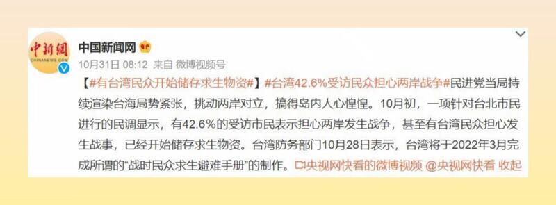 中国微博10月31日疯传一则中国官媒“中新网”的文章,写着“因为民进党渲染台海局势紧张,有42.6%的民众担心两岸发生战争,台湾人已经开始储存物资”,并贴出民众在美式卖场采购的画面。