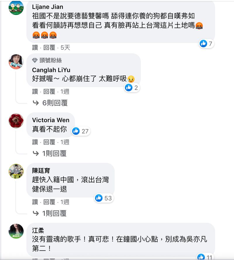 萧敬腾脸书粉丝页未见宣传《我们同唱一首歌》,但大批网友的骂声涌入其他贴文:“人民币真香”、“膝盖还好吗”、“你乖乖舔就好....何必把台湾扯进来”、“心都崩住了太难呼吸”、“赶快入籍中国,滚出台湾,健保退一退”、“没有灵魂的歌手!真可悲!在中国小心点,别成为吴亦凡第二!”、“看看何韵诗再想想自己,真有脸再站上台湾这片土地吗”、“黄安2.0”……