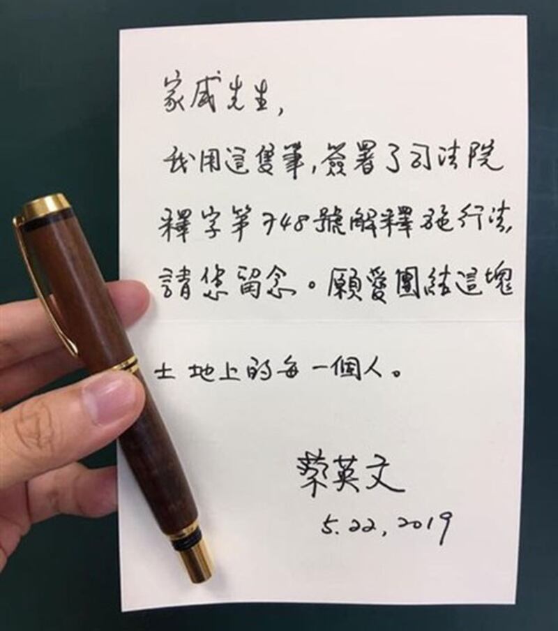 2019年5月22日,台湾总统蔡英文签署亚洲第一个同性婚姻专法后,将签署法案的笔,致赠给推动婚姻平权30多年的倡议者祁家威。