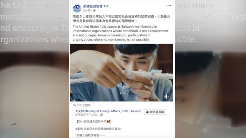 美国在台协会(AIT)24号在脸书分享外交部争取参加国际民航组织大会的视频,并发文表示,“美国全力支持台湾加入不需以国家为会员资格的国际组织,也鼓励台湾有意义参与以国家为会员资格的国际组织”。