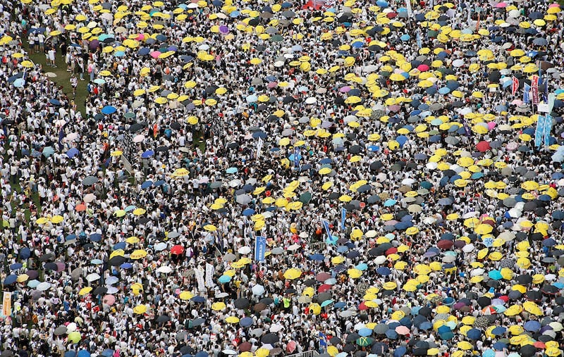 香港发生97年主权移交后规模最大的游行。下午2时30分,维多利亚公园中央草坪聚集了数万名抗议者,示威者打着黄色雨伞,高举写有“救救下一代”、“反送中”、“林郑下台”等标语,沿路一直高呼口号。下午2时30分,游行队伍从维园中央草坪出发,经铜锣湾高士威道,再到政府总部对面的添美道。在维园对面的中央图书馆门外,警方架起铁马和拉起封锁线,维持秩序。