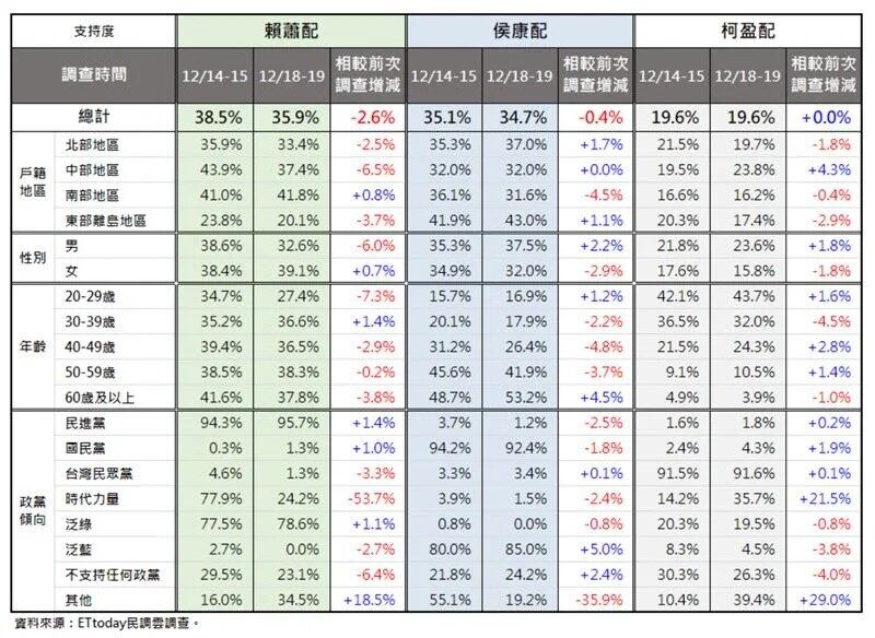 震传媒19日公布的民调显示,赖萧配31.4%,领先侯康配的29.6%,小幅领先1.8%,柯盈配则以20.5%的支持度暂居落后。