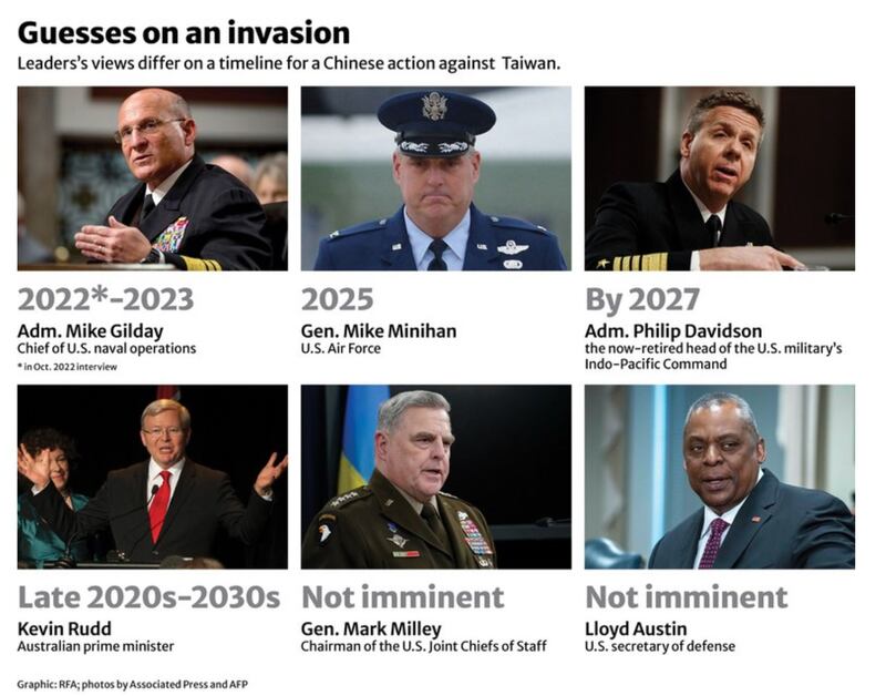但目前有为数不多的美国官员并不认同此预测,其中之一就是美国参谋长联席会议主席马克·米利将军,他说,鉴于俄罗斯总统普京的教训,他认为台海战争并不迫在眉睫。