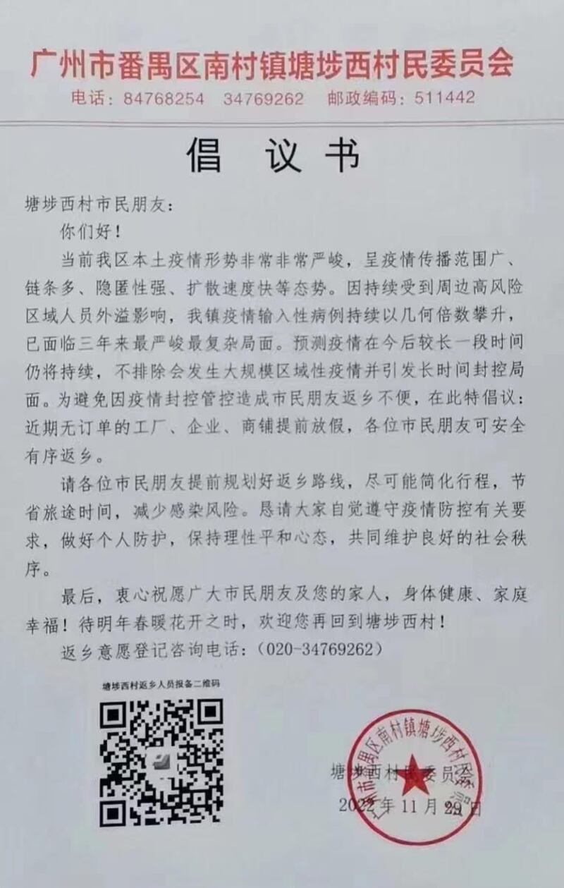 疫情较为严重的广州市番禺区南村镇塘埗西村民委员会周一发出一份“倡议书”写道,当前区内本土疫情形势非常严峻,并预测“疫情在今后较长一段时间仍将持续,不排除会发生大规模区域性疫情并引发长时间封控局面。”在此倡议:近期无订单的工厂、企业、商铺提前放假,各位市民朋友可安全有序返乡。