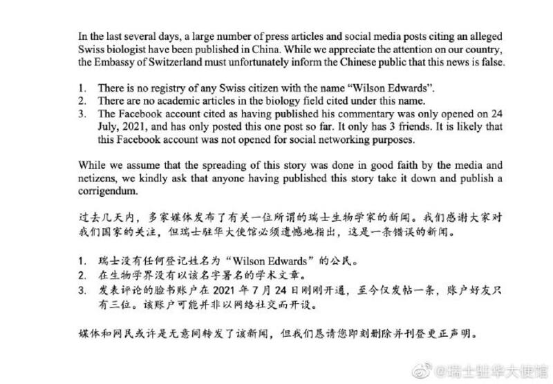 8月10日,瑞士驻北京大使馆发布声明指出,过去几天多家媒体发布有关一位“所谓的瑞士生物学家”的新闻是错误的。瑞士没有这位公民、这位不存在的瑞士专家更不可能发表学术论文,且经过瑞士官方查证,爱德华兹(Wilson Edwards)的脸书账号,2021年7月24日刚刚开通,至今仅发帖一条,账户好友只有三位。