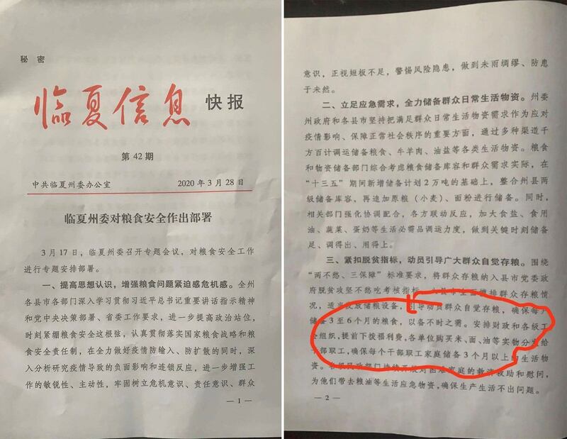 爆发于武汉的新冠肺炎已经肆虐全球,引起中国民众对粮食需求产生恐慌心理。湖北、重庆等地出现了抢购潮。中国新华社等官方媒体多次强调中国主要粮食充足。不过,一份署名“中共临夏州委办公室”的所谓秘密文件最近在网络热传。该文件显示,3月17日,临夏州委召开专题会议,就粮食安全工作进行专题安排部署。”其中写道:“州委州政府和各县市要通过多种渠道千方百计调运储备粮食、牛羊肉、油盐等各类生活物资”,同时要“引导动员群众自觉存粮,确保每户储备3至6个月粮食,以备不时之需”。该文件标注日期为2020年3月28日。