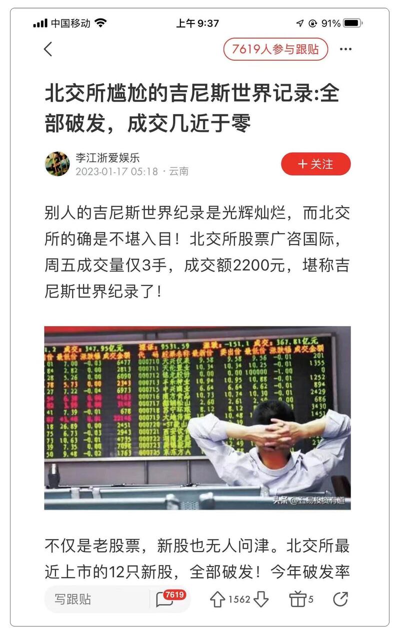 此外,2021年9月成立的北京证券交易所,近期出现成交量骤减的情况。1月13日,该交易所股票成交仅3手,成交金额2200元。不仅是老股票,就连新股票也无人问津,被网民嘲讽为“尴尬的吉尼斯世界纪录”,相关资讯已经被屏蔽。