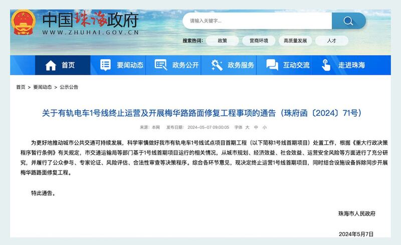 本周二(7日),珠海市政府发布通告,决定终止珠海有轨电车运营,同时拆除设施设备,并修复梅华路路面,新增2条汽车车道。2017年6月开通运营的的珠海有轨电车因供电技术、安全等原因,2021年暂停运营至今。据中国多家主流媒体报道,珠海有轨电车在运营期间的总计票款收入仅387万元,远低于三年多近3亿元的成本。根据测算,珠海有轨电车每人次运输成本(含资产折旧)约67元,而实际的票价为1元/人。相当于每服务一个乘客,需要补贴66元。