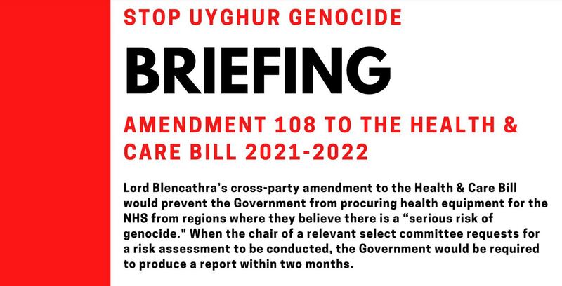 英国上议院正在审议《健康和保健法案》(Health and Care Bill)。多名上议员,包括布伦卡斯拉勋爵(Lord Blencathra)、肯尼迪男爵夫人(Baroness Kennedy)、史密斯男爵夫人(Baroness Smith)和奥尔顿勋爵(Lord Alton)提出修订案,要求内政大臣必须制订政策,确保英国的医疗用品和服务采购符合英国在《防止及惩治灭绝种族罪公约》(Convention on the Prevention and Punishment of the Crime of Genocide)下的义务,即不得从存在严重种族灭绝风险的国家进行采购。