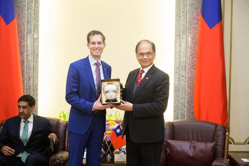 台湾的立法院长游锡堃(右)20日会见美国麻萨诸塞州民主党籍联邦众议员欧清杰(Jake Auchincloss)(左)等一行人。(游锡堃办公室提供)