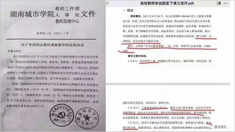 湖南城市学院人事处的文件表述:“李剑同志教学水平和能力欠缺,在课堂上不能较好地引导学生树立社会主义核心价值观,达不到为党育人、为国育才的要求。”