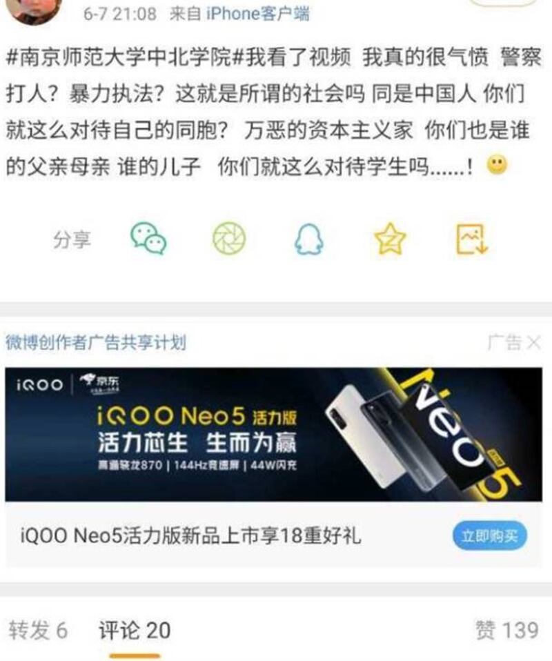 从微博帖子的记录来看,多位参与本次抗议的学生曾批评香港抗争者、力挺港警维稳。如今,网络视频显示各省警察以同样的铁拳,将内地学生按倒在地,打得头破血流,冲着眼睛喷洒辣椒水,拉扯女生头发,用警棍围攻。