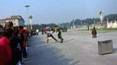 从录像中可以看到,一些访民一边高喊冤枉,一边冲向国旗旗杆。几名武警则负责把访民拖走。其中有一个在国旗前下跪的中年妇女被武警一把扔出几米之外。围观的中外人士排成人墙,议论纷纷。