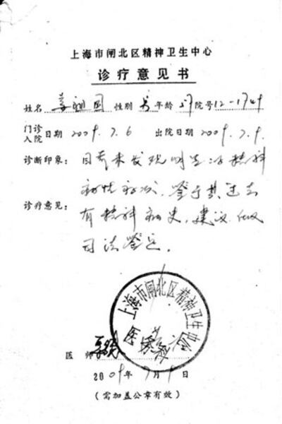 姜劲男还向本台提供了那次对他父亲作出无精神病症状的证明。她希望外界伸出援手,更希望国际人权机构能关注该案,使姜祖国早日被释放。