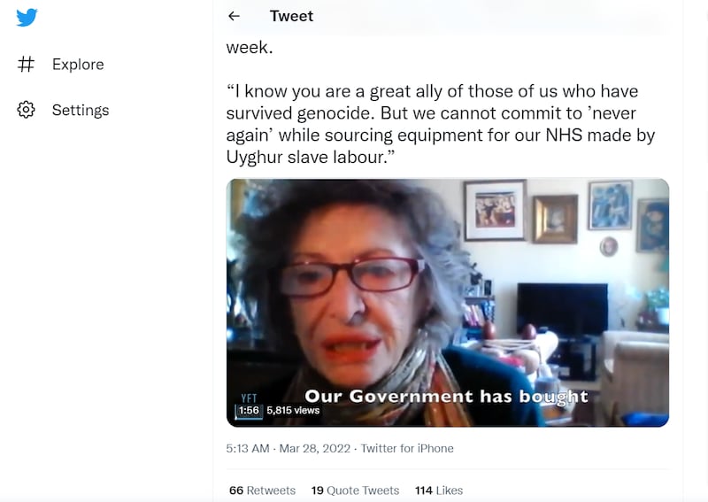 朵芮特说:“帮助我们的医护人员使用被劳役的维吾尔人所生产的设备,是不可接受,也是不道德的。我深深体会种族灭绝带来的创伤,因此我非常在意英国未有尽力制止日渐恶化的维吾尔种族灭绝。你有机会改变这个情况,让‘永不再犯’不再流于空话。”