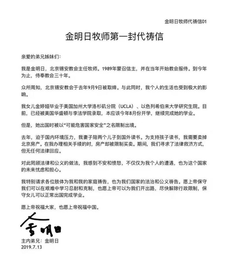 金明日在代祷信中说,去年,迫于国内环境压力,他的妻子陪两个儿子到国外读书。为支持孩子读书,他需要卖掉北京的房产。但在他办理相关手续时,才得知房产被限制买卖。为此,金明日曾寻求法律救济方式, 但无任何法律回应。