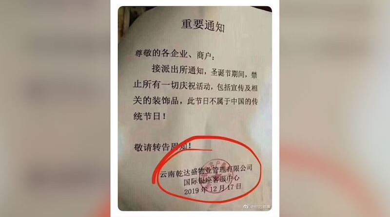 云南省昆明市经济开发区内一大型住宅商业区的物业管理公司近期向当地企业及商户发出通知,禁止庆祝圣诞节。12月17日,云南乾达盛物业管理公司发出一份通知,声称接派出所通知,圣诞节期间禁止所有一切庆祝活动,包括宣传及相关的装饰品,此节日不属于中国的传统节日。