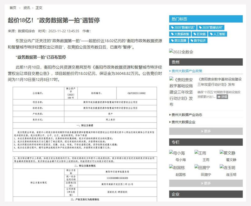 在大数据时代,中国政府信息受到严格保护,而公民个人信息时常遭到泄露,包括被转让获利。据《中国新闻周刊》等多家媒体报道,11月10日,衡阳市公共资源交易中心发布公告,以网上竞价的方式拍卖“衡阳市政务数据资源和智慧城市特许经营权出让项目”,项目起始价为十八亿元。此乃中国官方第一次公开拍卖大数据。