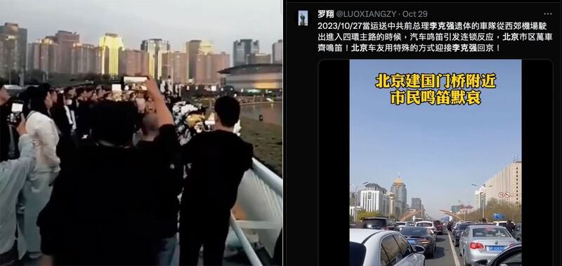 网络上流传的相关视频显示,载着李克强遗体的移灵车队从北京西郊机场离开,开往301医院,车队行驶沿路交通管制。除此之外,在北京街头几乎看不到任何悼念活动。