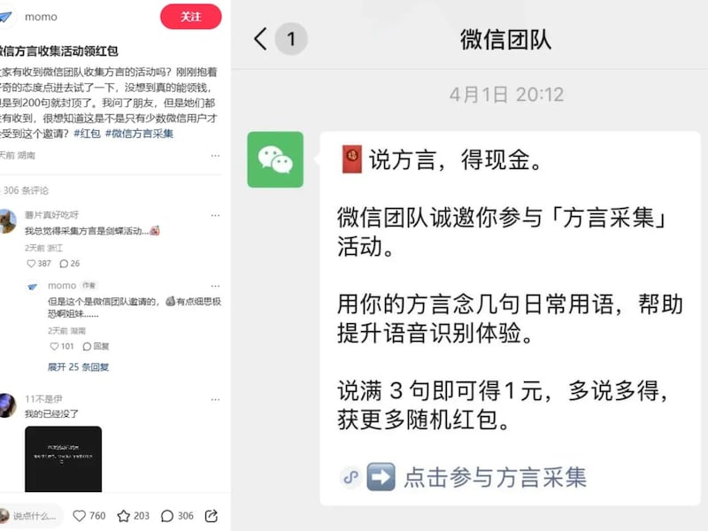 中国社交平台微信近期推出“方言采集”返现活动,邀请用户录制各地方言语音(即声纹)以换取现金奖励。活动上线后,有参与者称累计获得数百元收益。随着参与范围扩大,讨论延伸至个人隐私问题,方言曾被中国网民视为相对隐蔽的交流方式。