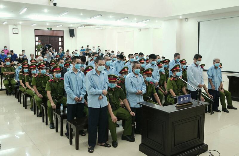 Tại phiên sơ thẩm diễn ra vào tháng 9 năm 2020, tòa tuyên án tử hình đối với hai bị cáo Lê Đình Chức và Lê Đình Công về tội Giết người với cáo buộc họ "chủ mưu, cầm đầu vụ giết người"; án chung thân cho bị cáo Lê Đình Doanh; 16 năm tù cho bị cáo Bùi Viết Hiểu; 13 năm tù cho bị cáo Nguyễn Quốc Tiến; 12 năm tù cho bị cáo Nguyễn Văn Tuyển. Những người này đều bị kết tội Giết người. Tổng cộng 71 năm 3 tháng tù cho 23 bị cáo khác với cáo buộc tội Chống người thi hành công vụ.