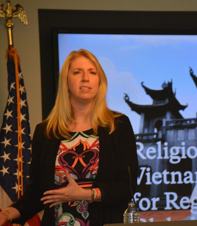 Ỷ Lan : Như chị biết cuộc phỏng vấn này dành cho Đài Á châu Tự do Việt ngữ, tôi mong được biết ý kiến chị đối với Việt Nam. Trong bản phúc trình năm nay, USCIRF đề nghị đưa Việt Nam trở lại danh sách CPC, tức các quốc gia đàn áp tôn giáo cần đặc biệt quan tâm. Chị thấy thế nào tình hình tự do tôn giáo tại Việt Nam ?