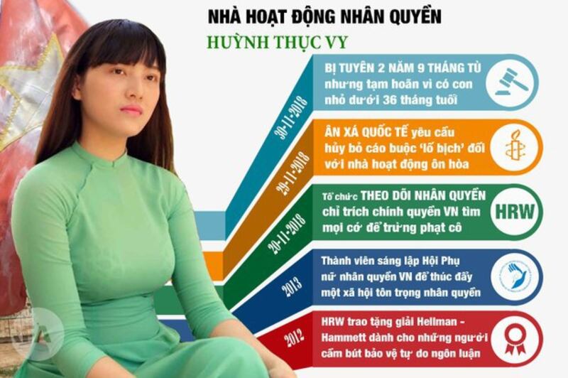 Cô Huỳnh Thục Vy vào ngày 30/11/18 bị tòa án tại Buôn Hồ, tỉnh Đăk Lăk tuyên án 2 năm 9 tháng tù giam với cáo buộc “xúc phạm quốc kỳ” theo điều 276 Bộ Luật Hình Sự và bản án sẽ có hiệu lực khi con của cô tròn 3 tuổi; tuy nhiên hiện nay cô không được phép rời khỏi nơi cư trú. Cô Huỳnh Thục Vy bộc bạch với RFA nhân ngày Phụ nữ Quốc tế, 08/03/19: